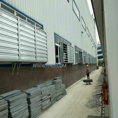 在廠房窗戶的一端安裝上降溫水簾片/濕簾墻降溫設(shè)備,與之相對的一端安裝負(fù)壓風(fēng)機(jī),應(yīng)用負(fù)壓風(fēng)機(jī)將廠房內(nèi)的熱氣抽出,在通風(fēng)散熱除塵的同時(shí),室內(nèi)外造成氣壓差,促使外界的空氣經(jīng)由降溫水簾片/濕簾墻所形成的水膜蒸發(fā)吸熱瞬間降溫,涼爽空氣便會(huì)源源不斷的吹入廠房內(nèi)部,進(jìn)而營造一個(gè)舒適、涼爽、清新的工作環(huán)境。
