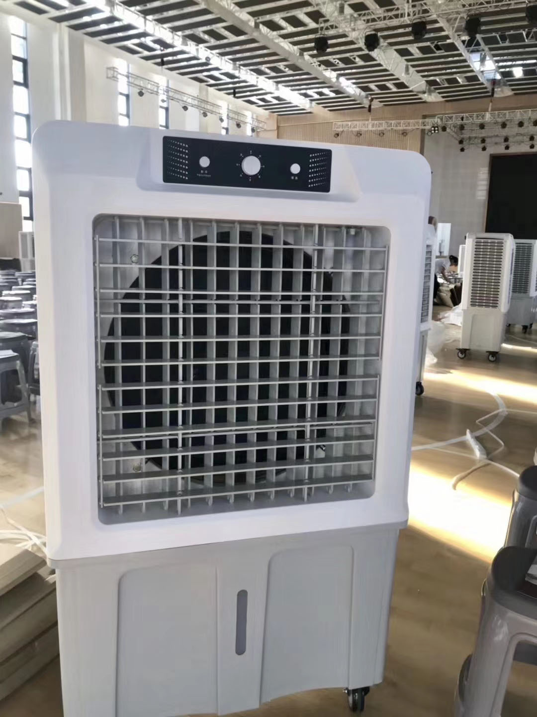 高大空間通風(fēng)換氣方法辦法每小時57.5次將近每分鐘1次的換氣次數(shù)就騰煌節(jié)能環(huán)保空調(diào)的特點,水冷空調(diào)TH-23A功率僅為1.5KW,一般的工廠車間只需要不到30次/時的換氣次數(shù),那么一臺水冷空調(diào)23A就可以滿足130-200平左右的車間通風(fēng)降溫的需求。服務(wù)熱線13316055627