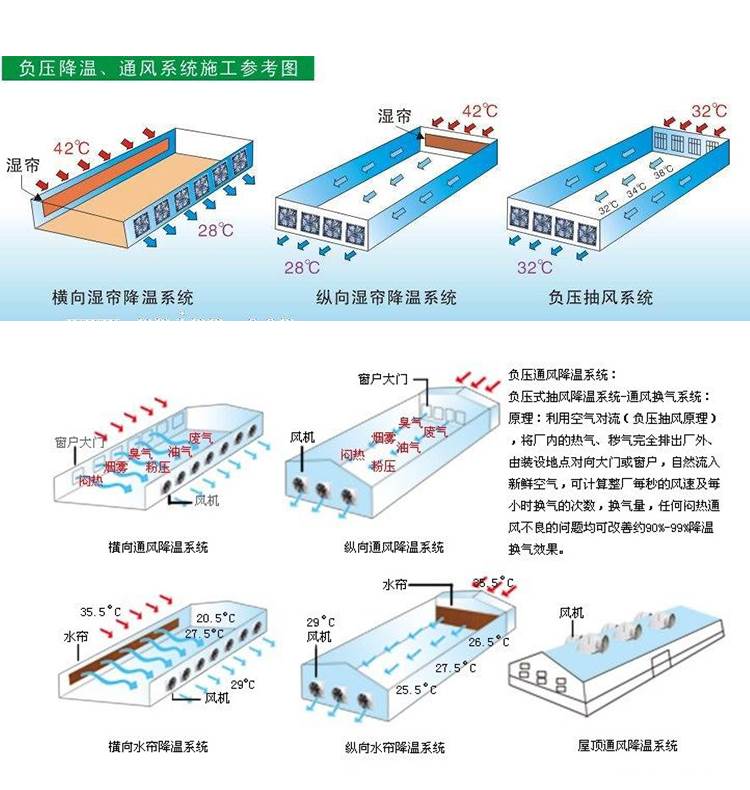 3.   通風(fēng)機(jī)排風(fēng)降溫,是用風(fēng)機(jī)運轉(zhuǎn)來降溫,其產(chǎn)品有電扇,風(fēng)機(jī),軸流風(fēng)機(jī),離心風(fēng)機(jī)等,其特點是價格便宜,安裝方便。通風(fēng)效果明顯,但降溫效果不佳。